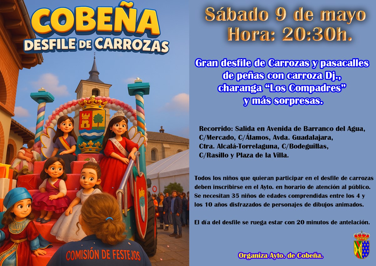 El sábado 9 de mayo, a las 20:30 h, tendrá lugar un gran desfile de carrozas y pasacalles de peñas, que contará con carroza DJ, la charanga “Los Compadres” y diversas sorpresas a lo largo del recorrido.