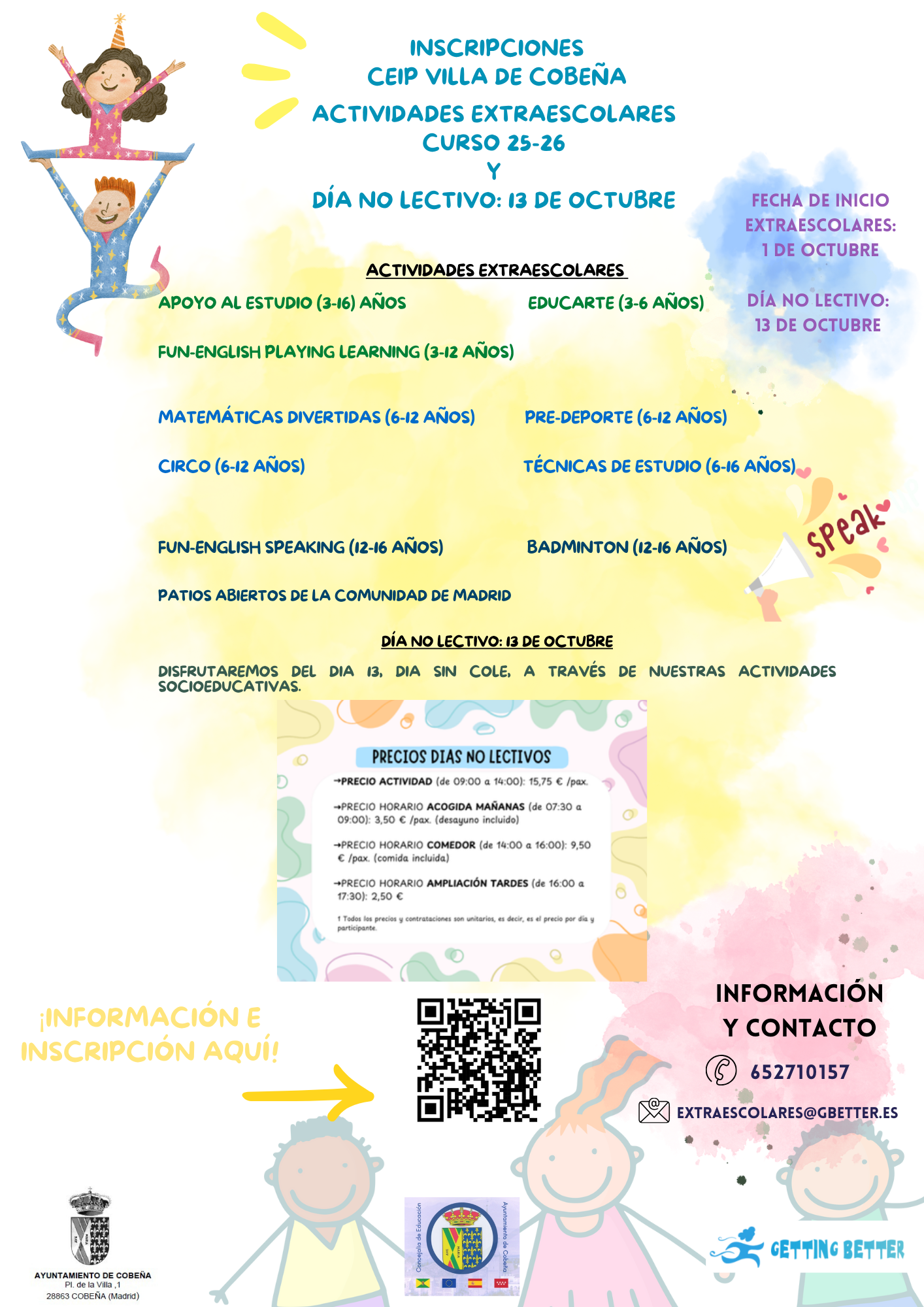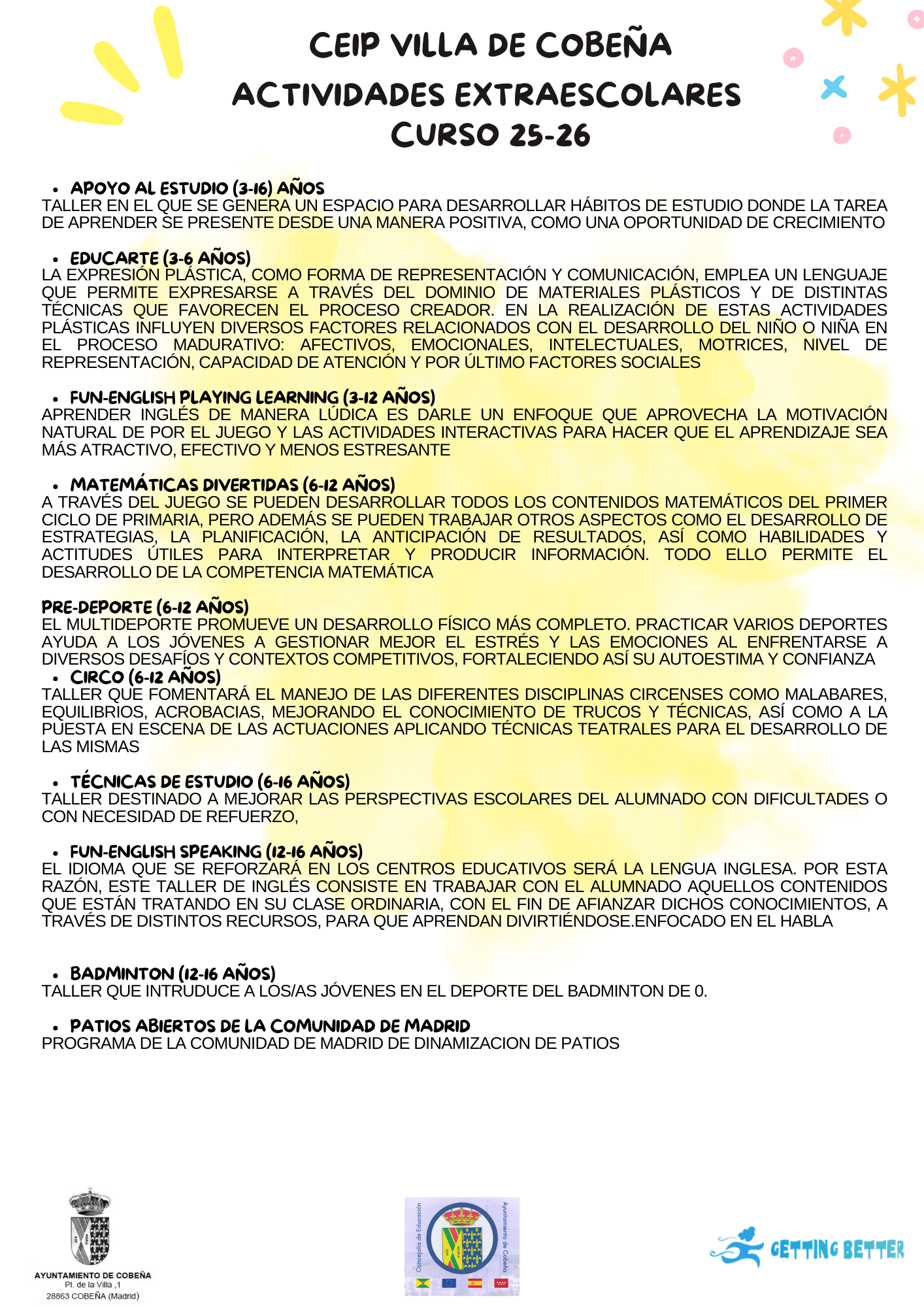 El programa de Actividades Extraescolares está organizado por la Concejalía de Educación del Ayuntamiento de Cobeña y cofinanciado por la Comunidad de Madrid.